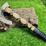 The Viking Hatchet - Battle Forge is a meticulously handcrafted tool that merges ancient craftsmanship with modern utility. Featuring a razor-sharp 1095 steel blade, intricately hand-engraved, this hatchet boasts superior strength and durability, with a Rockwell Hardness rating of 55-60 HRC. The handle is crafted from sturdy ash wood and wrapped in premium leather for a comfortable grip. Ideal for everyday use, this Viking-inspired hatchet comes with a protective leather sheath, ensuring it's always ready for action. Perfect for chopping, camping, or as a collector's piece, this hatchet blends functionality and aesthetic appeal.