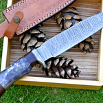 Introducing our formidable Hunting Bowie Knife, a blend of traditional craftsmanship and modern durability. This knife features a robust Damascus steel blade, renowned for its strength and sharpness, making it ideal for hunting and outdoor use. The handle is crafted from a combination of Colored Bone and Rosewood, providing both visual appeal and ergonomic comfort. With a Damascus guard for added protection, this knife measures 14 inches in overall length and comes complete with a premium leather sheath for convenient carrying. Whether you're tracking game or exploring the wilderness, our Hunting Bowie Knife is a reliable companion for all your outdoor adventures.