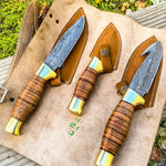 Wilderness Trio: 3-Piece Hunting Knives Set with Damascus Steel Blades, Stacked Leather Handles, Brass Guards, and Leather Roll
