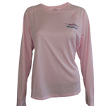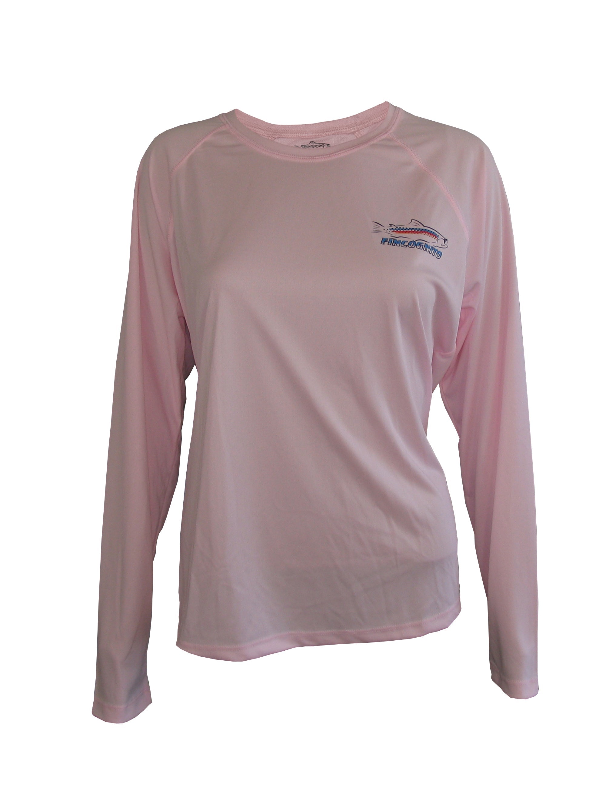 Lightweight sun protective SPF 50 fishing shirts with a raglan sleeve women's cut. We place Travis Sylvester's "Freestone" cutthroat trout on the back of this Pink Blossom-colored long sleeve T. The Fincognito logo adorns the left chest.  100% polyester with PURE-Tech wicking technology. Our fly fishing apparel works well on the water or as hiking clothes on the trail. Great sun protection, moisture wicking apparel.