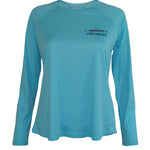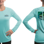 Lightweight sun protective SPF 50 fishing shirts with a raglan sleeve women's cut.  We place Ed Anderson's "Hen Rainbow" on the back of this water blue-colored long sleeve T.  The Fincognito logo adorns the left chest.  100% polyester with PURE-Tech wicking technology. Our fly fishing apparel works well on the water or as hiking clothes on the trail. Great sun protection, moisture wicking apparel.