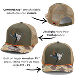 The Wood Duck waterfowl duck hunting 5-panel trucker hat features ultra lightweight micro-ripstop fabric and mesh back. Coupled with a trucker style structured front panel featuring a detail wood duck embroidery. Additionally, features our COMFORT SNAP™ elastic closure which couples the stretch fit of a custom cap with the adjustability of a snapback. Lastly, this duck hunting cap rope cap features American Fit™ sizing which fits men's head sizes MD - XX.