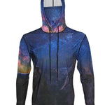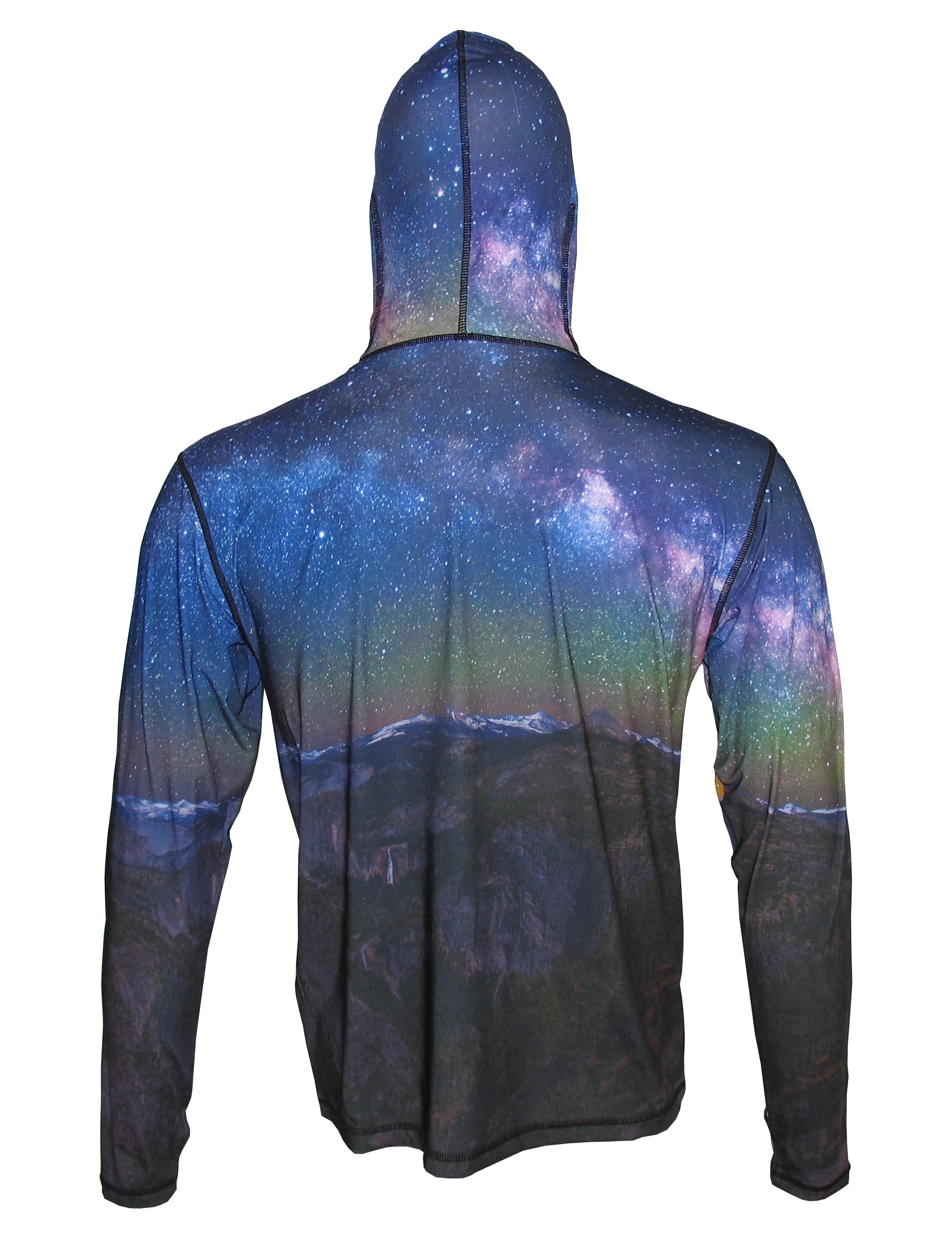 Our Mountaincognito wildlife graphic hoodie series includes "Yosemite" which captures the Milky Way over Yosemite National Park.  Our photographic picture hoodie art presents many of our country's national parks.  The sun protective UPF50 Sunpro Hoodie features a lightweight (150gr.) 4-way stretch fabric (85% polyester 15% Spandex) for comfort and fit unmatched. An internal neck gaiter built into the hood is included for free. Great sun protection, moisture wicking apparel.